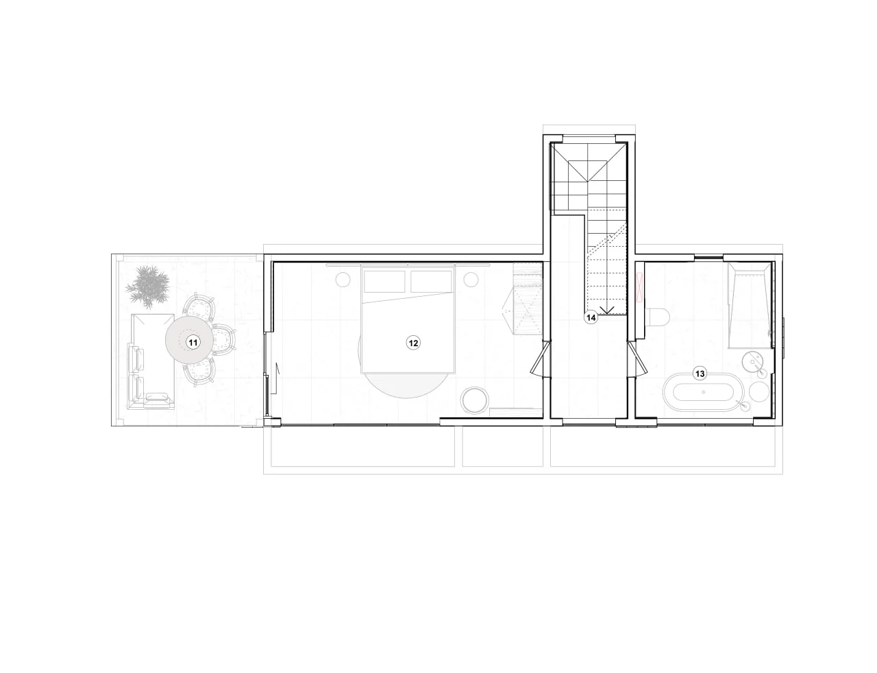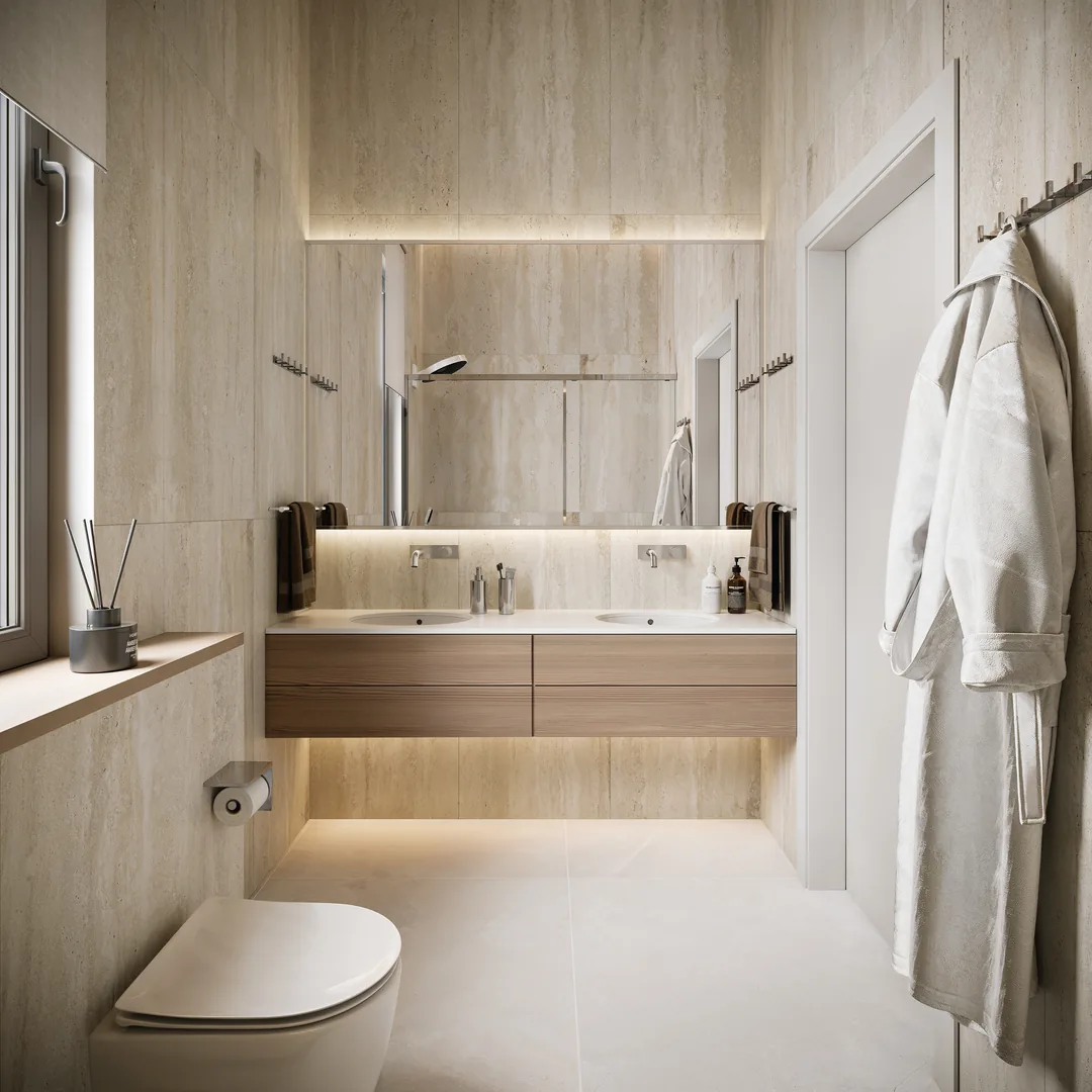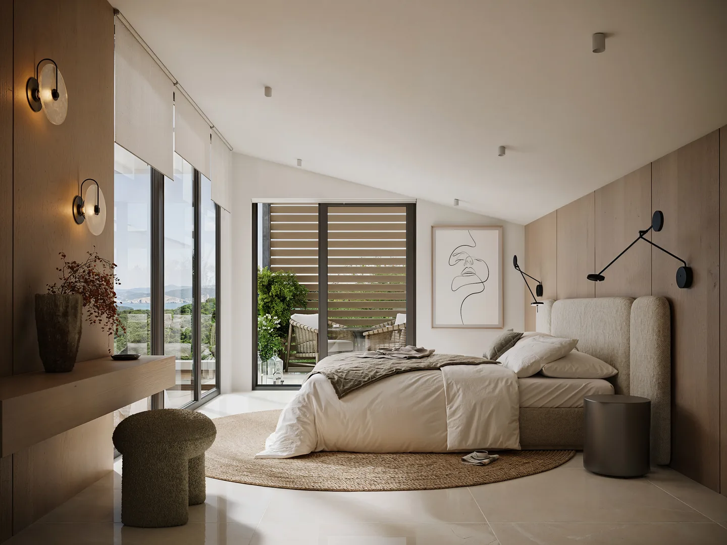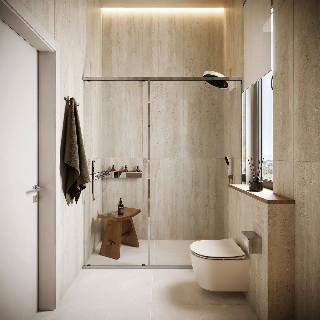 Master Suite: A luxurious retreat featuring a king-size bed, and a master bathroom with a concealed waterfall shower set.
