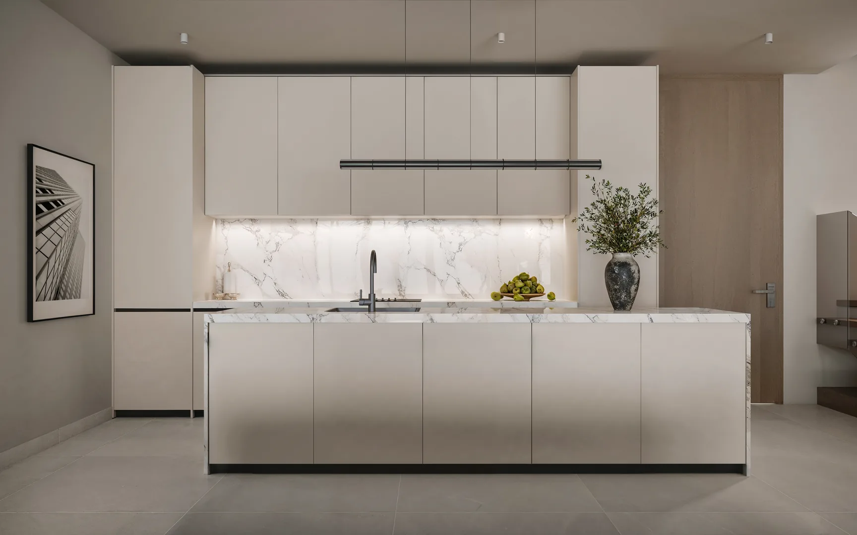 Gourmet Kitchen: Equipped with sintered stone countertops and European Grade EO plywood cabinetry. It includes a modern island and appliances.